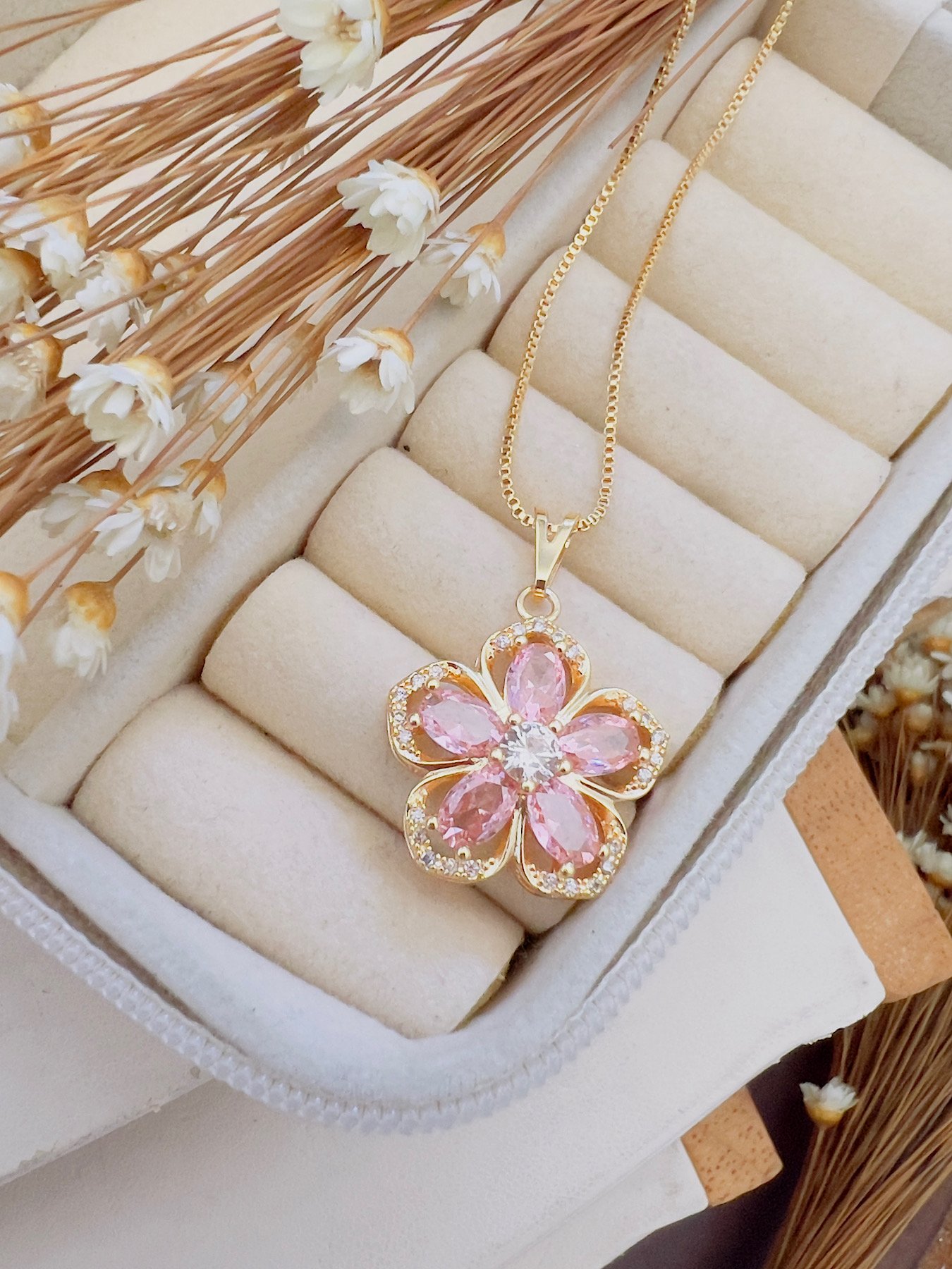 4. Colar Folheada a Ouro Micro Zircônia Flor Rosa 5558
