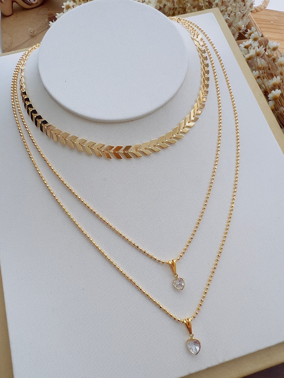 Colar Triplo Folheado a Ouro Escama Lisa Coração Zircônia 7352