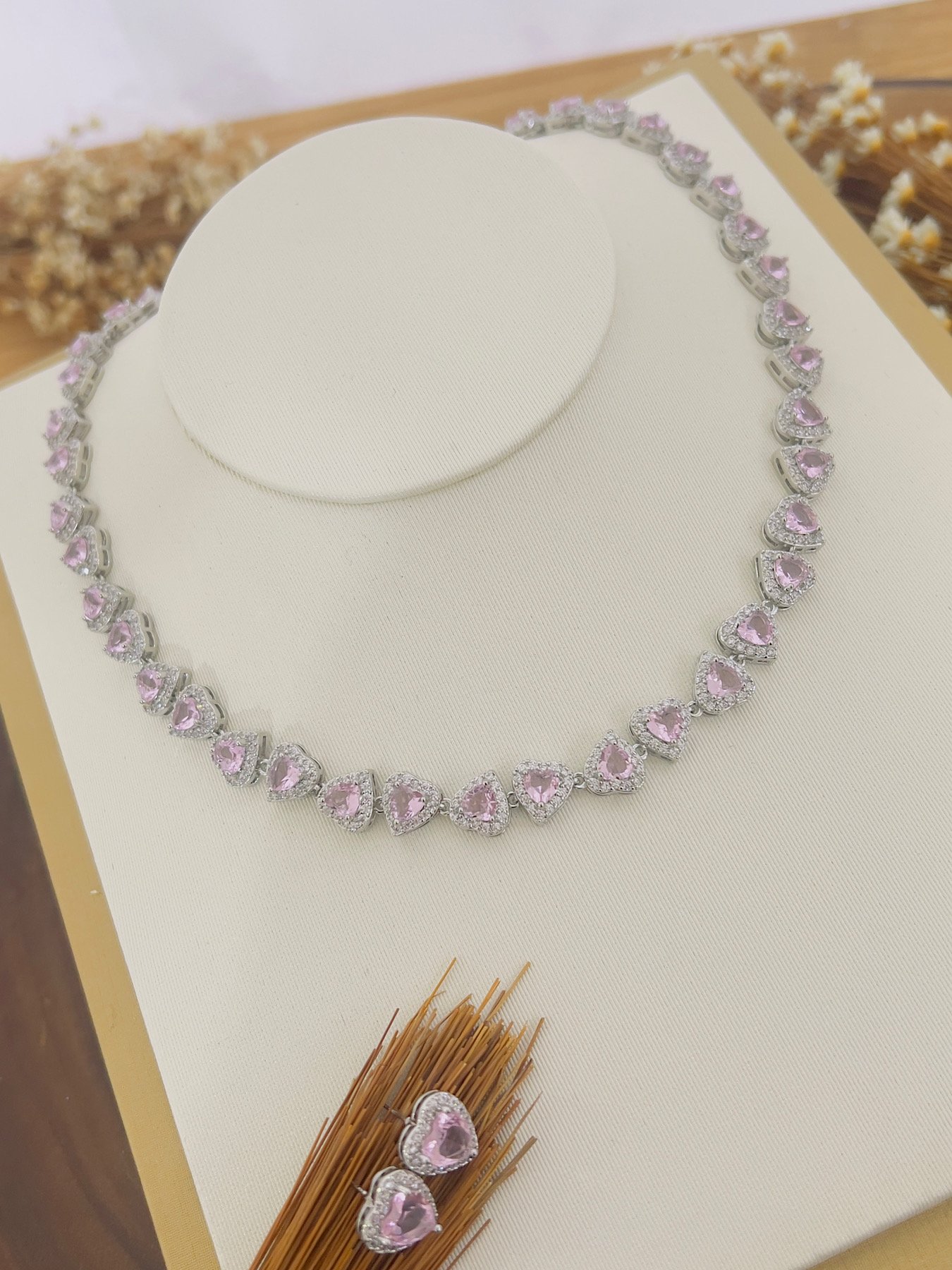 Conjunto Cravejado Inspiração Coração Prata Rosa 9191