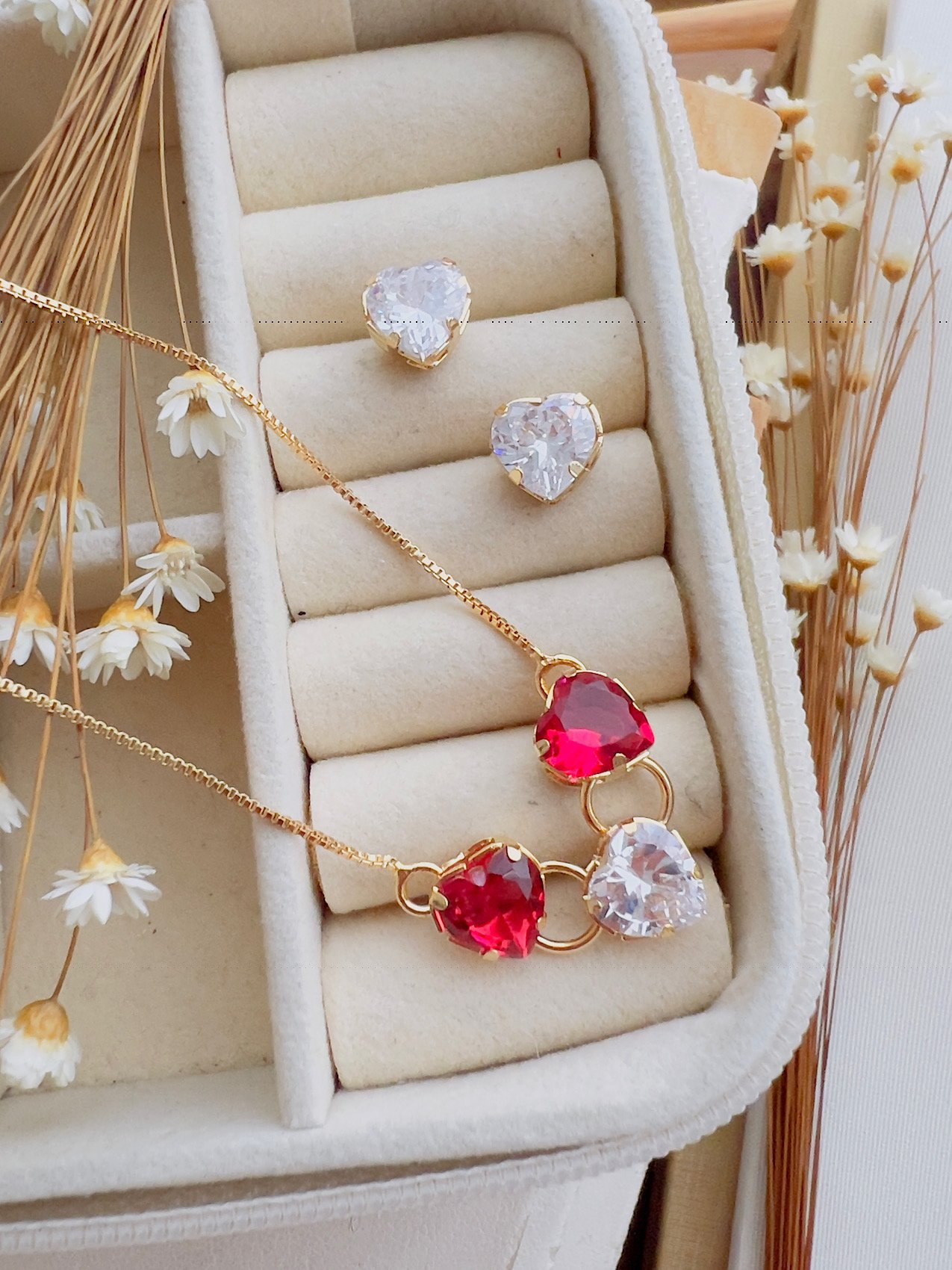 3. Conjunto Semijoia Coração Zircônia Cristal/Pink 959