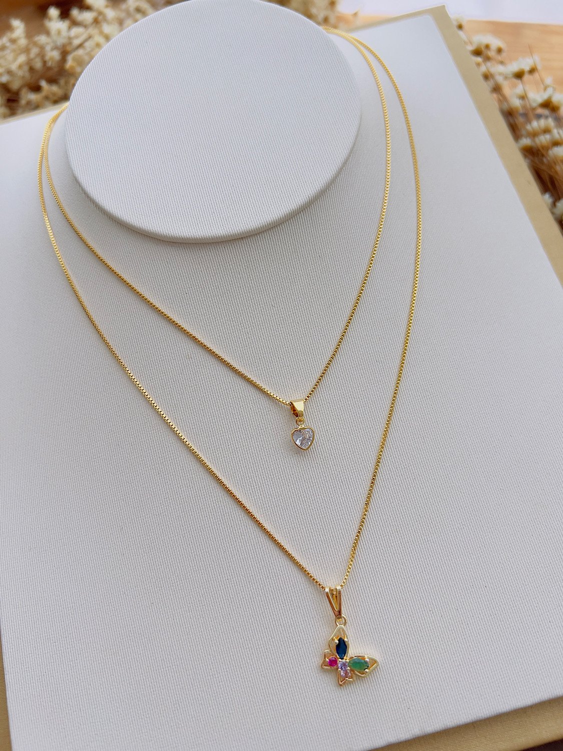 Dois Colares Folheado a Ouro Micro Zircônia Borboleta Coração 3633
