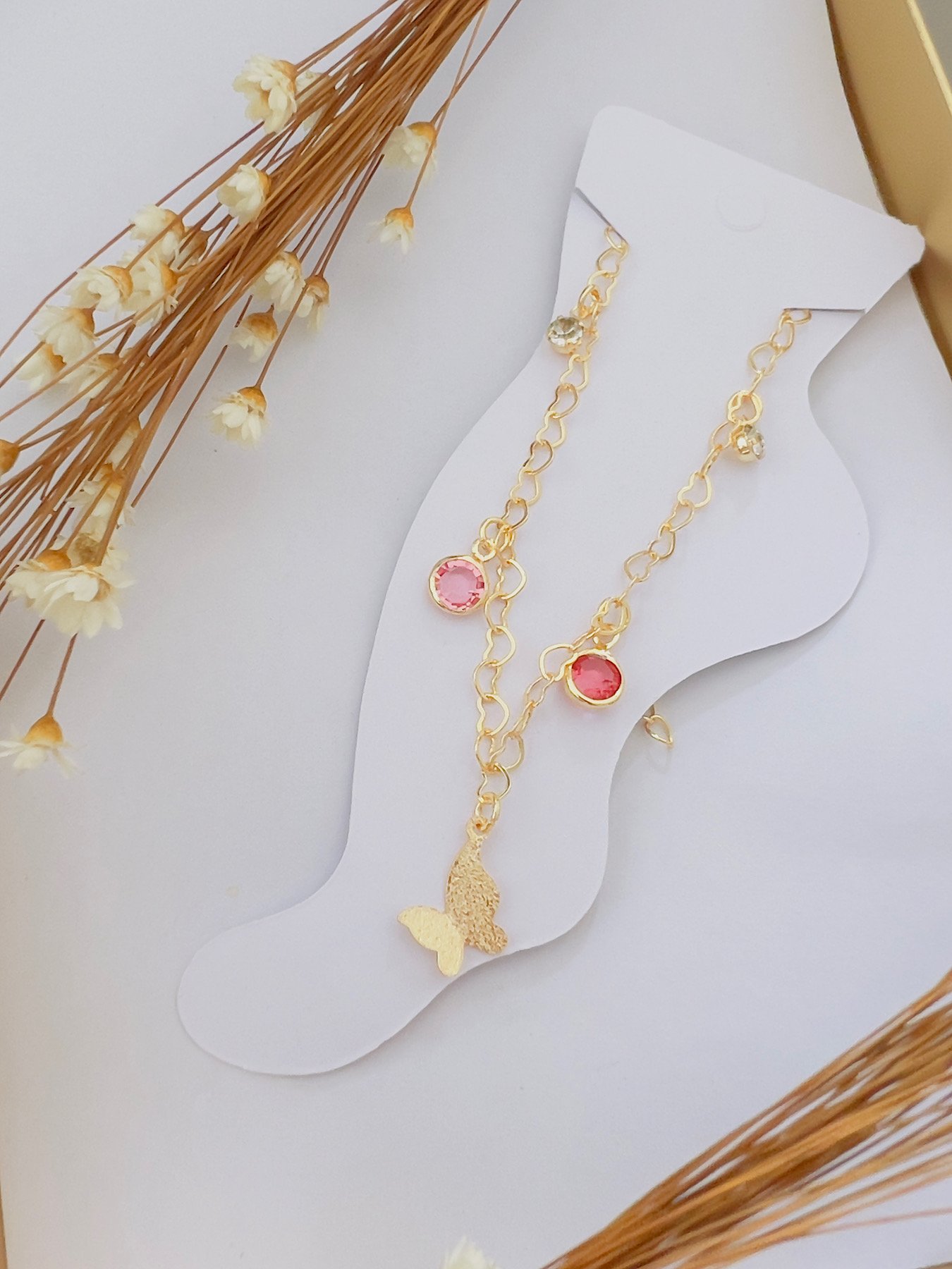 Tornozeleira Folheado a Ouro Strass Borboleta Rosa 6307